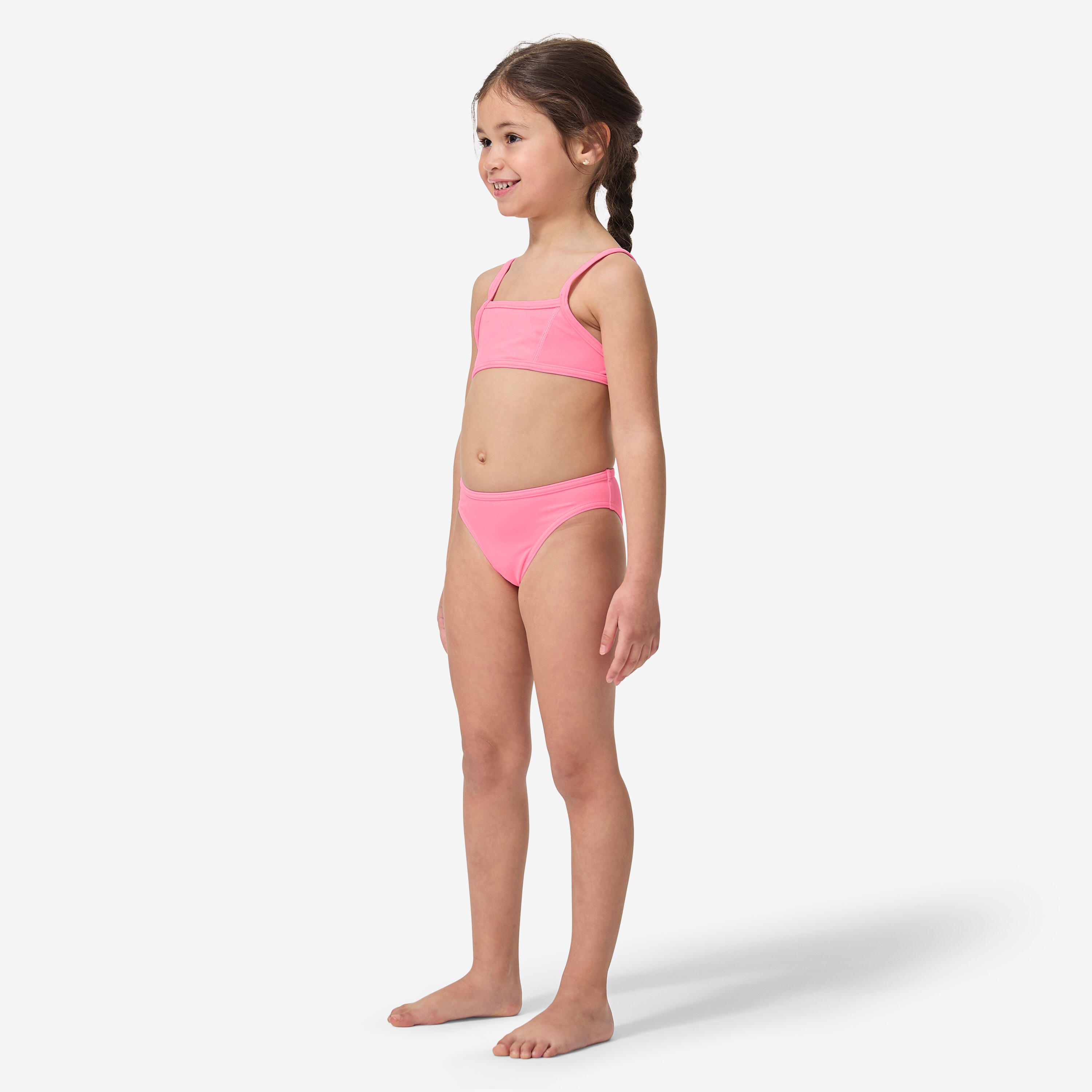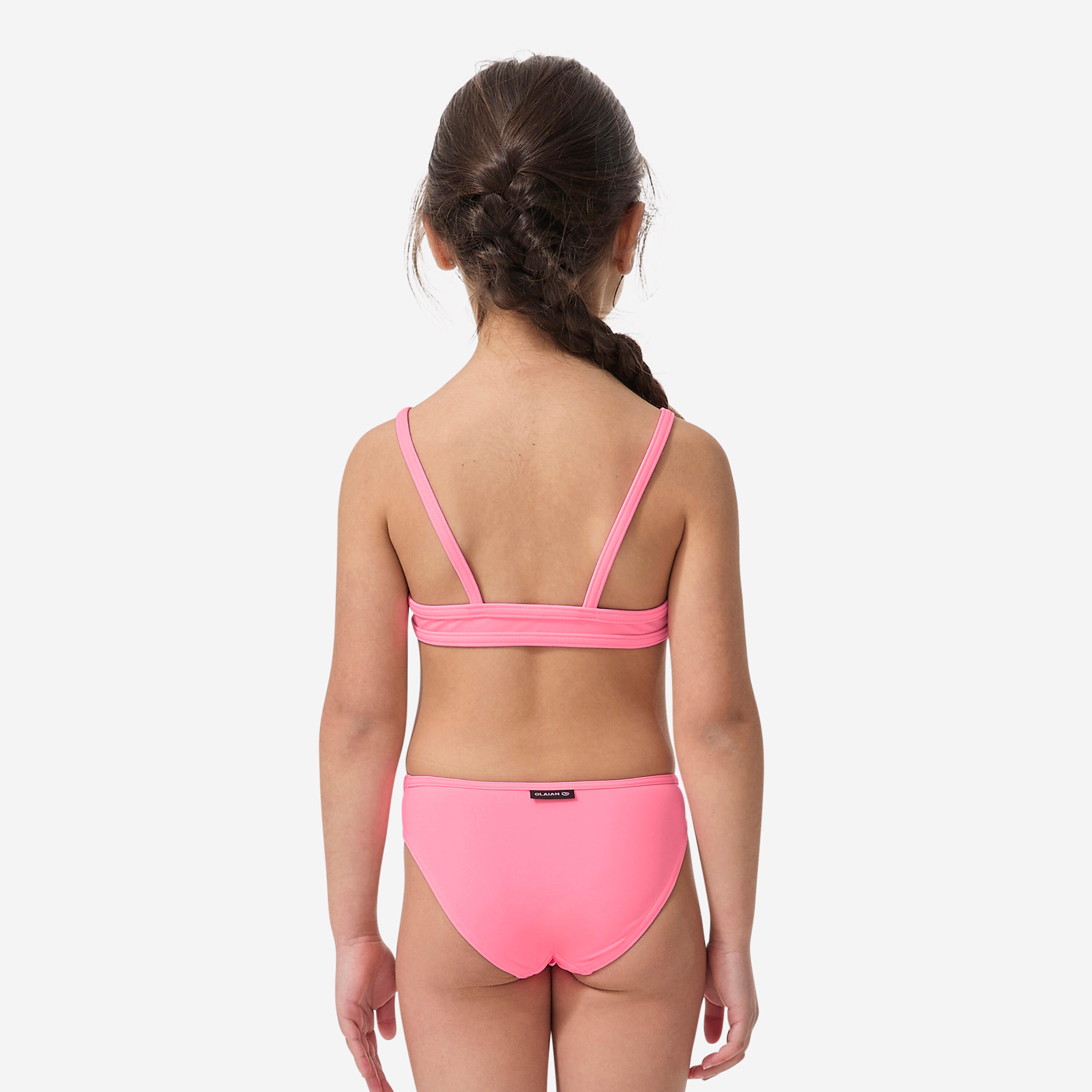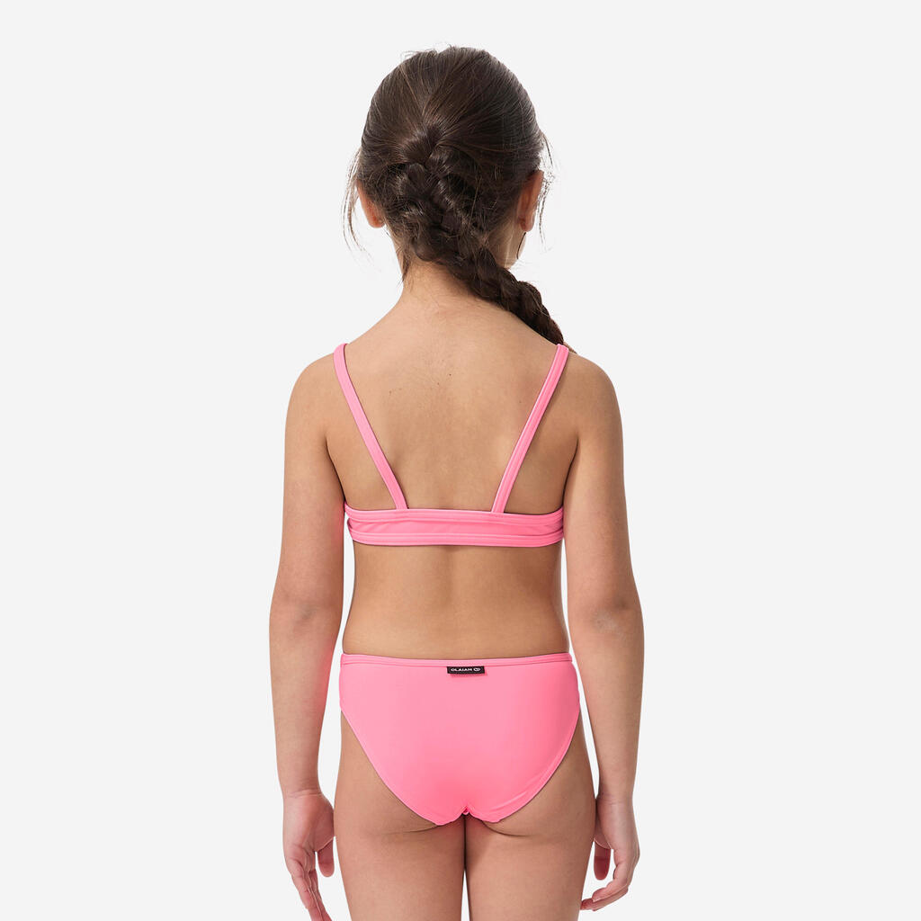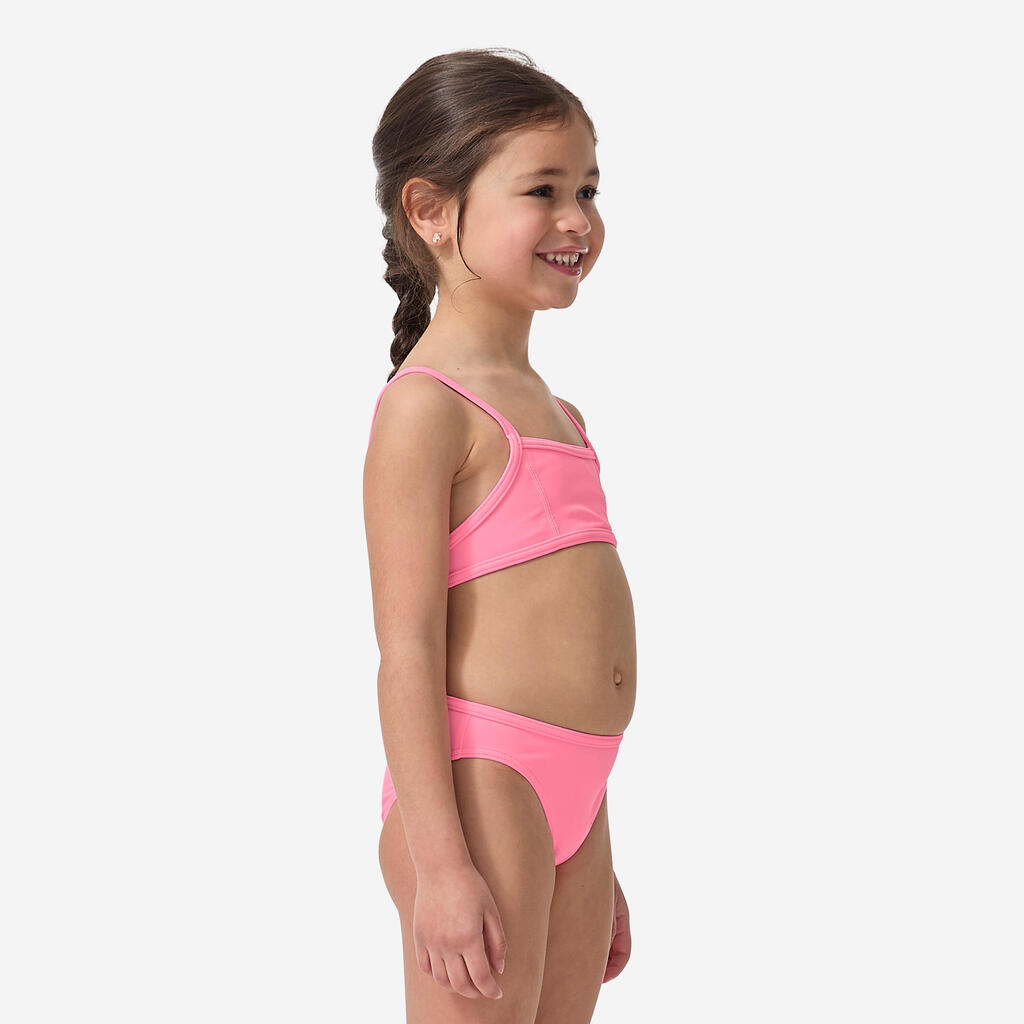 Dvodelni kupaći kostim za devojčice ima dve tanke bretele na leđima i klasičan donji deo, tako da ostaje na mestu u talasima.