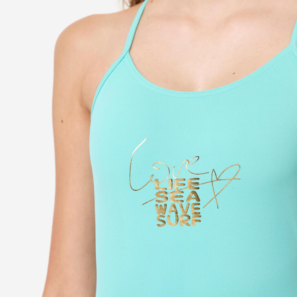 Ovaj jednodelni kupaći kostim je dizajniran tako da vaša ćerka može da otkrije radosti surfovanja.