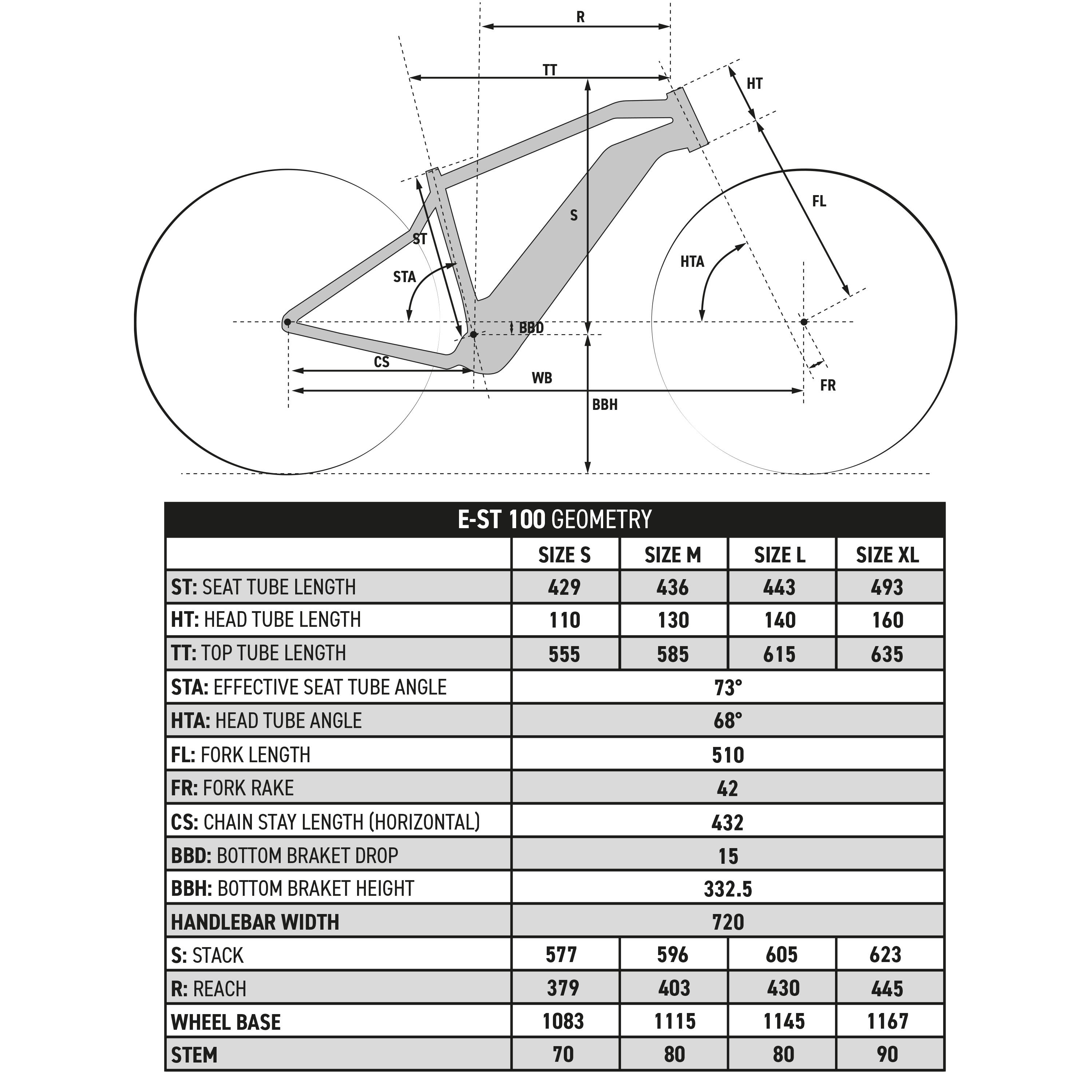 Lula od aluminijuma (720 mm) Rockrider: drška 70 mm (veličina S), 80 mm (veličina M/L) ili 90 mm (veličina XL), koja se može podići uz pomoć 5 intervala podešavanja: + 0 mm, + 7,5 mm, + 15 mm, + 22,5 mm, + 30 mm.