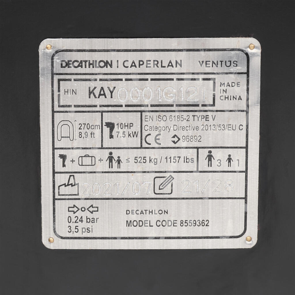 Materijal: Ojačano platno 0,82 mm. Dno na naduvavanje visokog pritiska (debljine 10 cm). Kobilica na naduvavanje ispod poda. Prečnik komore (cevi): 42 cm. Težina (čamac + sedište + vesla): 37 kg. Maksimalno opterećenje: 525 kg.
