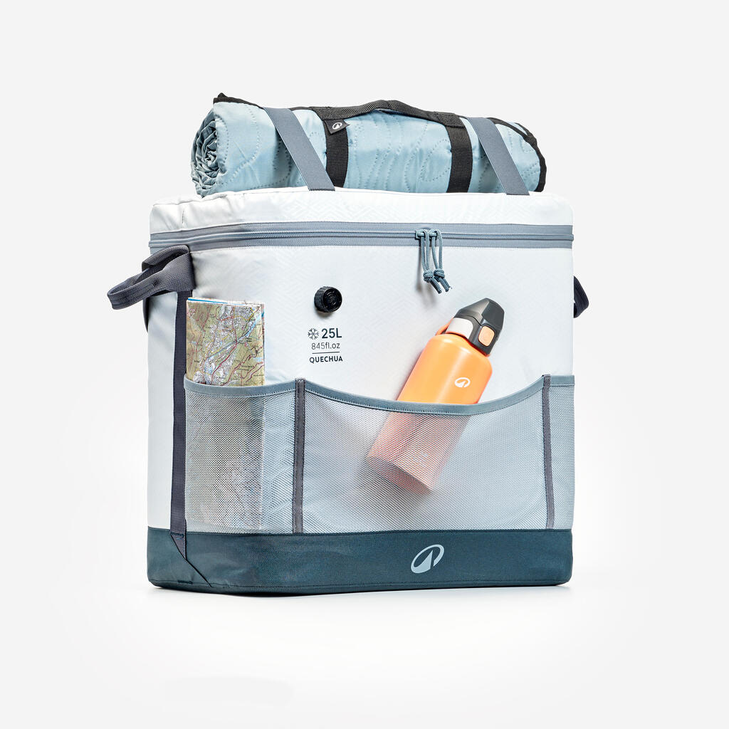 Na spoljašnjoj strani ćete pronaći tri rastegljiva mrežasta džepa. Zahvaljujući razdelniku u torbi, možete bolje organizovati stvari. Ako ga stavite vodoravno, hranu možete staviti ispod njega, pa će biti hladna duže vreme. Ako ga stavite uspravno, u torbu možete organizovati hranu.