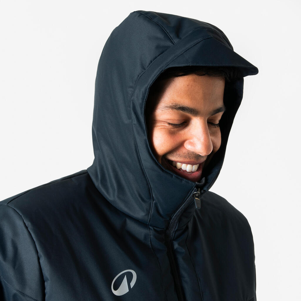 Dugačka i vodootporna parka s kapuljačom, džepovima i podesivim rajsferšlusom.