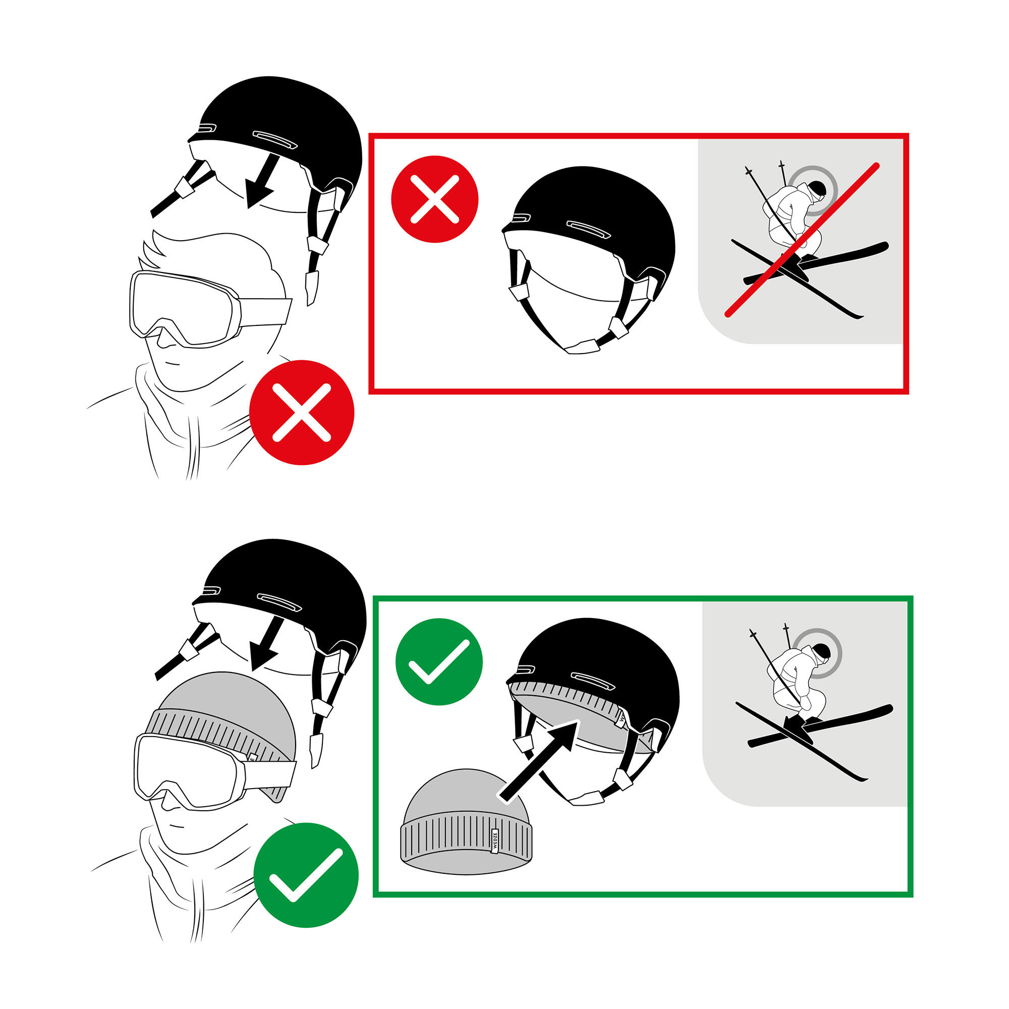 Obavezno isprobajte kacigu s naočarama i kapom pre nego što je kupite. Traka i kopče naočara mogu varirati u debljini, u zavisnosti od brenda. Isto važi i za kape, velika je razlika u veličini između tankih i debelih kapa, a sve to utiče na veličinu kacige koja vam je potrebna.