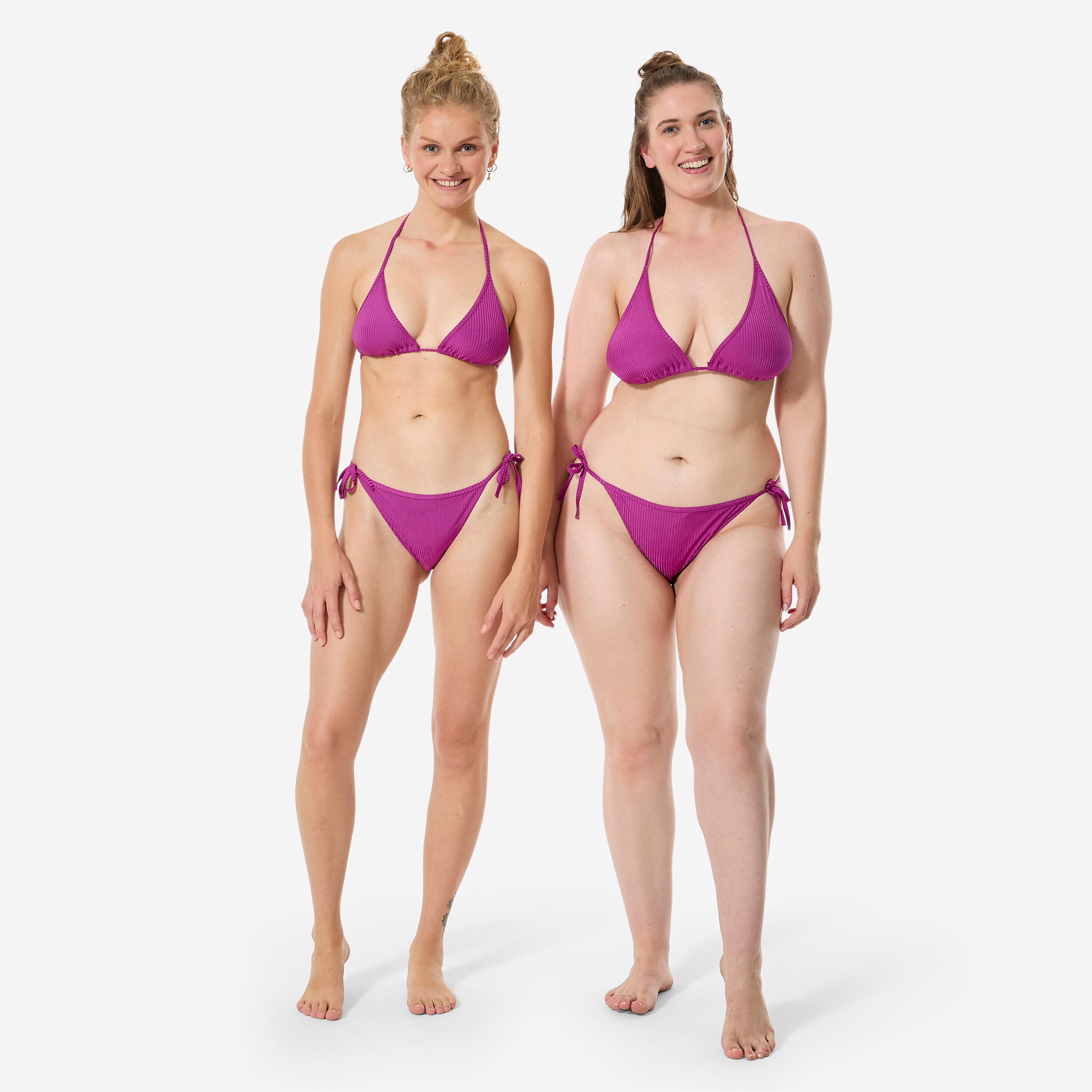 Trouglasti bikini s nefiksiranom donjom stranom lako se prilagođava različitim građama tela. Zbog male podrške koju pruža, naročito dobro pristaje malim ili srednjim veličinama grudi. Veoma je udoban, zahvaljujući vezivanju na vratu i leđima, kao i trouglovima koji se mogu pomerati, omogućavajući vam da birate koliko ćete otkriti grudi. Udobnosti doprinosi i kroj i mekoća materijala.