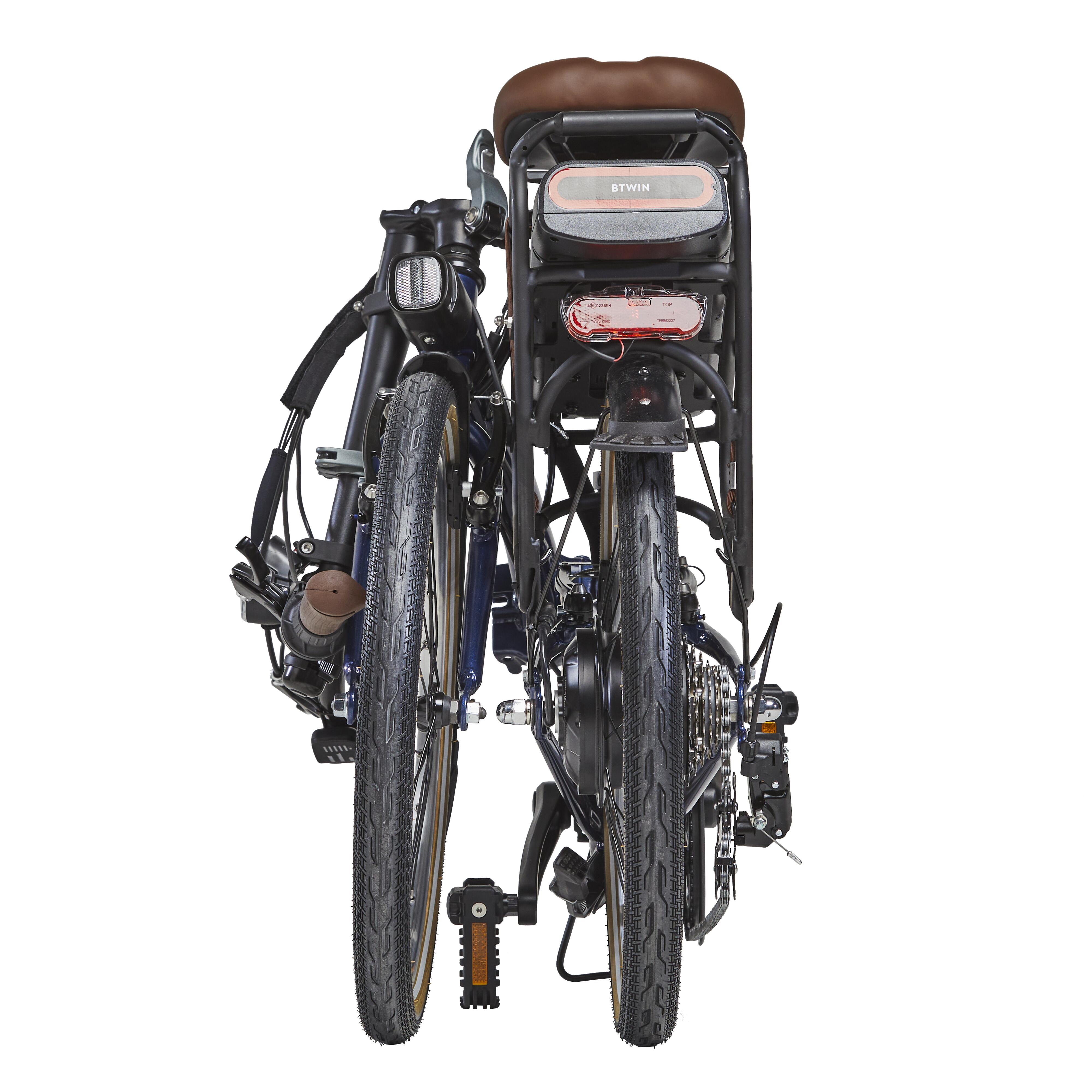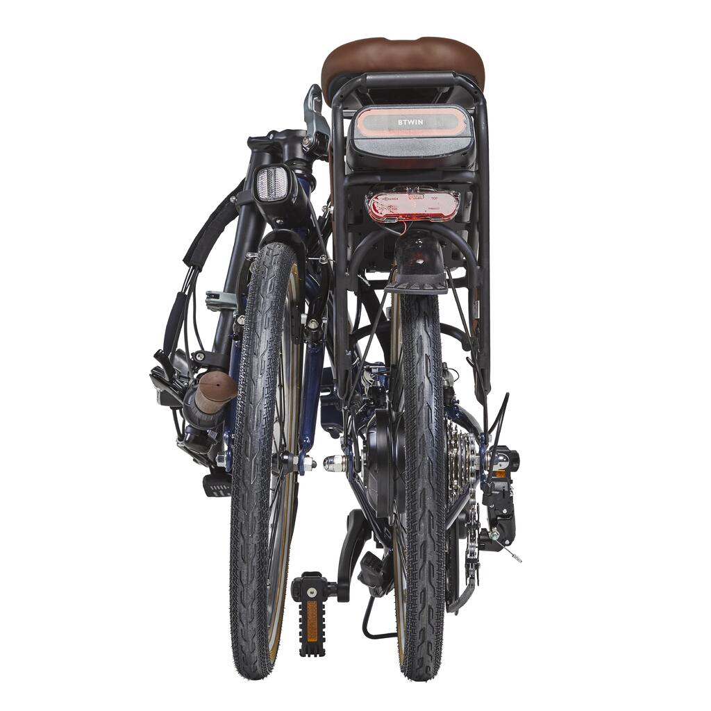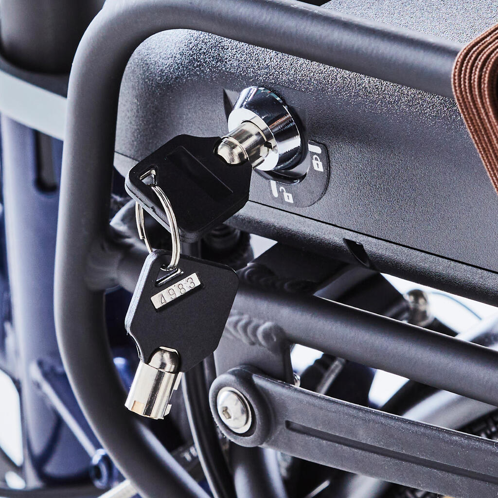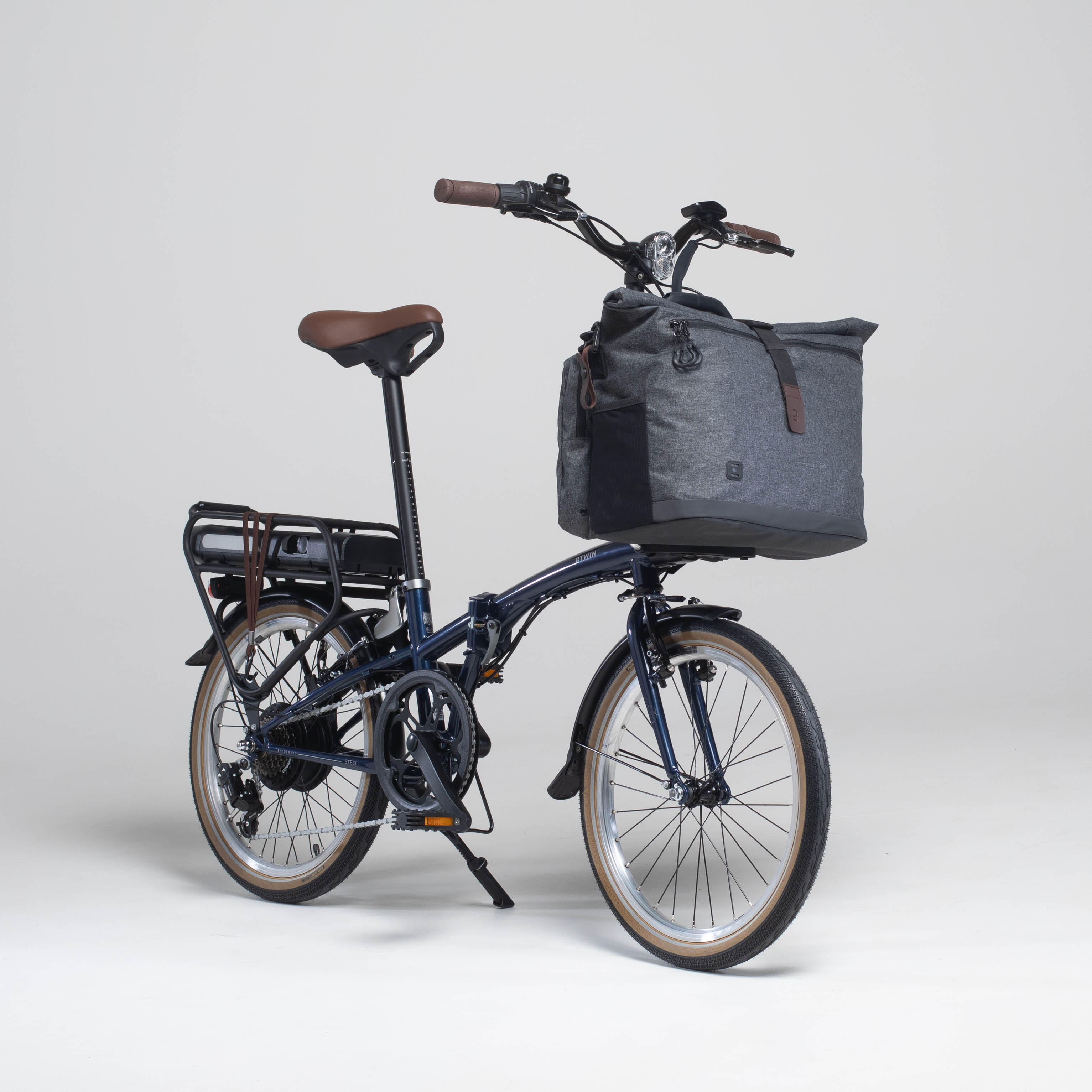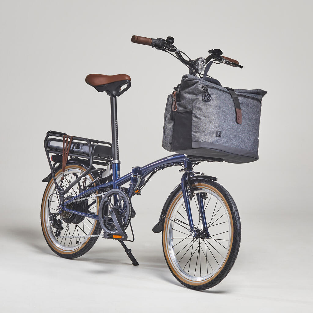 Kompatibilni dodaci: - Prednja torba od 25 litara koja se kači za 1 sekund. Specijalno je dizajnirana za sklopive bicikle B'Twin. Posebna korpa za prtljag je direktno zakačena za prednji deo rama (ref: 8735484 / model pušten u martu 2023).