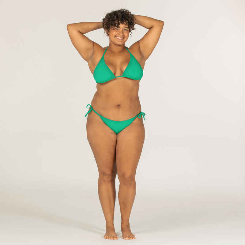 Trouglasti bikini s nefiksiranom donjom stranom lako se prilagođava različitim građama tela. Zbog male podrške koju pruža, naročito dobro pristaje malim ili srednjim veličinama grudi. Veoma je udoban, zahvaljujući vezivanju na vratu i leđima, kao i trouglovima koji se mogu pomerati, omogućavajući vam da birate koliko ćete otkriti grudi. Udobnosti doprinosi i kroj i mekoća materijala.