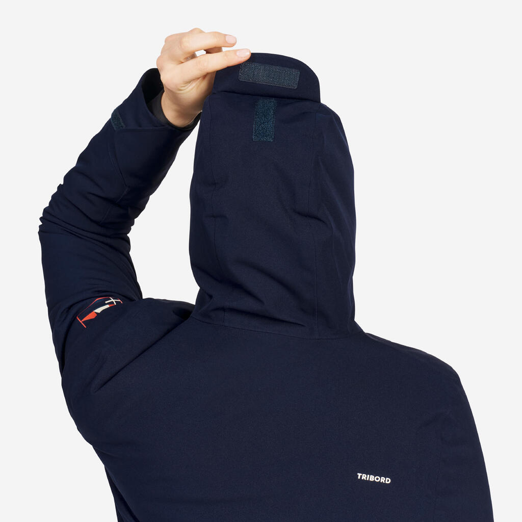 Vodootporna jakna za jedrenje za toplotu i suvoću! Duga jakna (impregnirani pamuk) sa postavom, manžetnama, visokom kragnom, velikom kapuljačom, džepovima sa rajsferšlusom; veliki plus kada jedrite