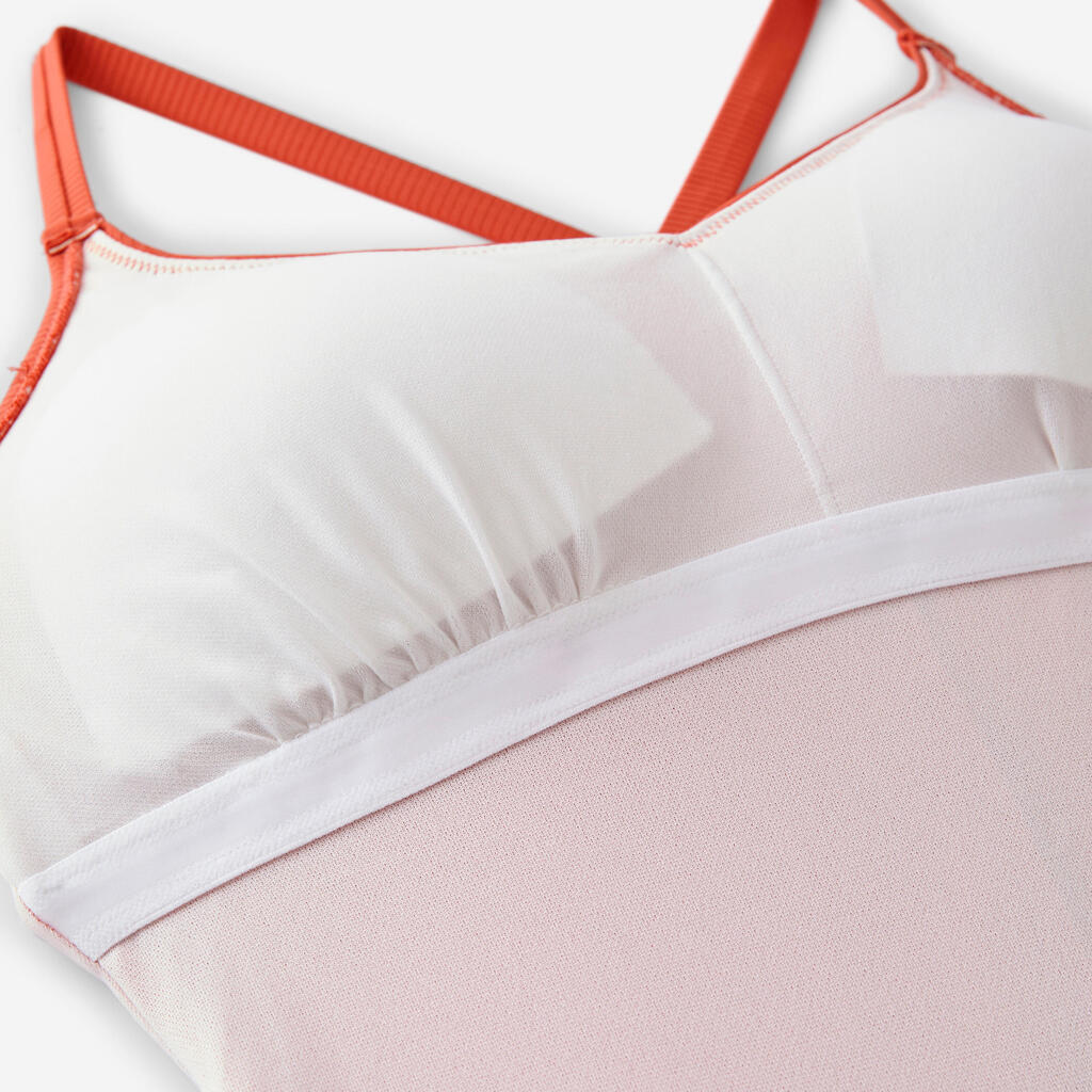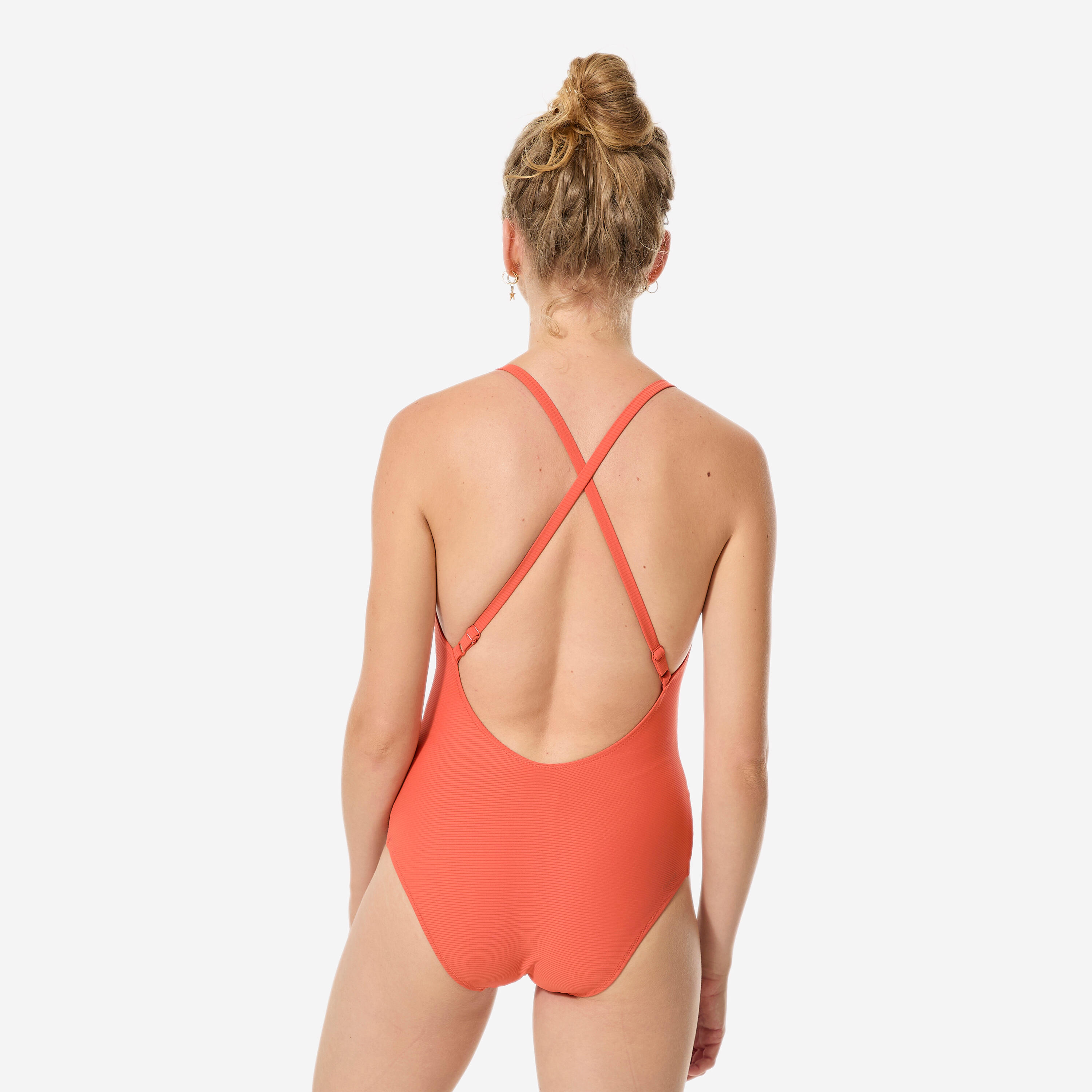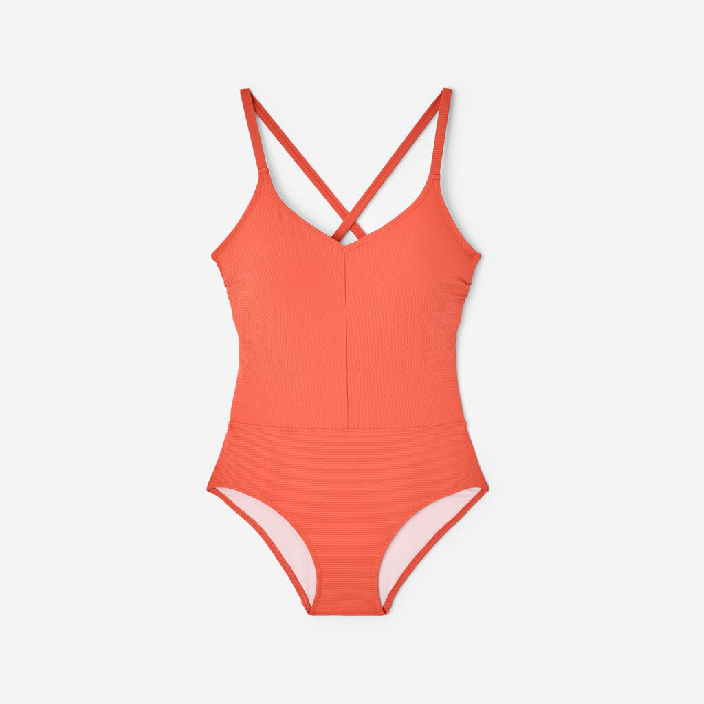 Ovaj jednodelni kupaći kostim od teksturisanog materijala je idealan za sve građe tela! Tanke bretele, ukrštene na leđima, ušiven grudnjak i uklonjive korpe: podesite ga kako god želite.