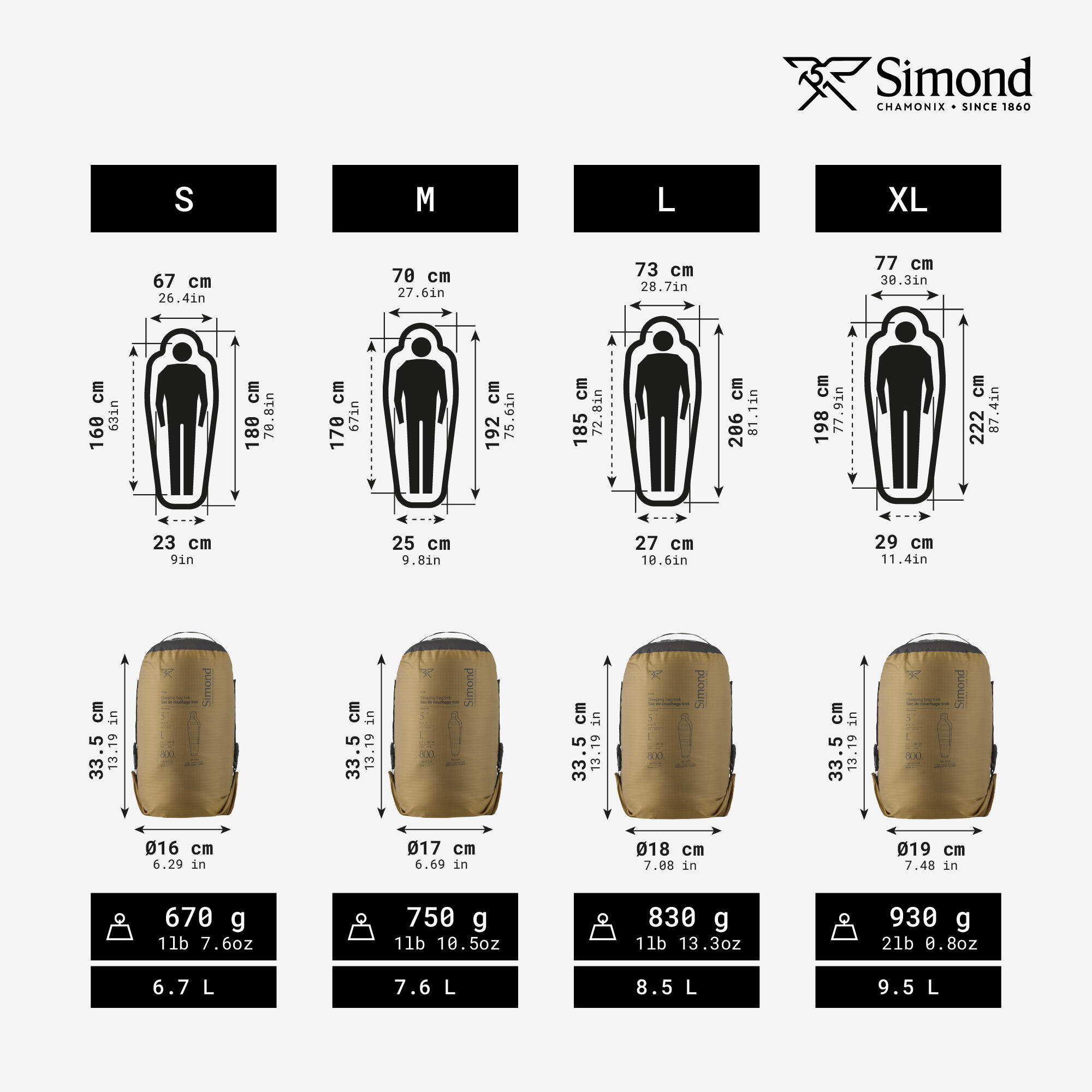 Veličina XL (korisnici od 1,85 m do 2 m): 930 g (sa 420 g paperja/perja)Sklopljene dimenzije: Š 31 cm Ø 18 cmZapremina 9,5 l