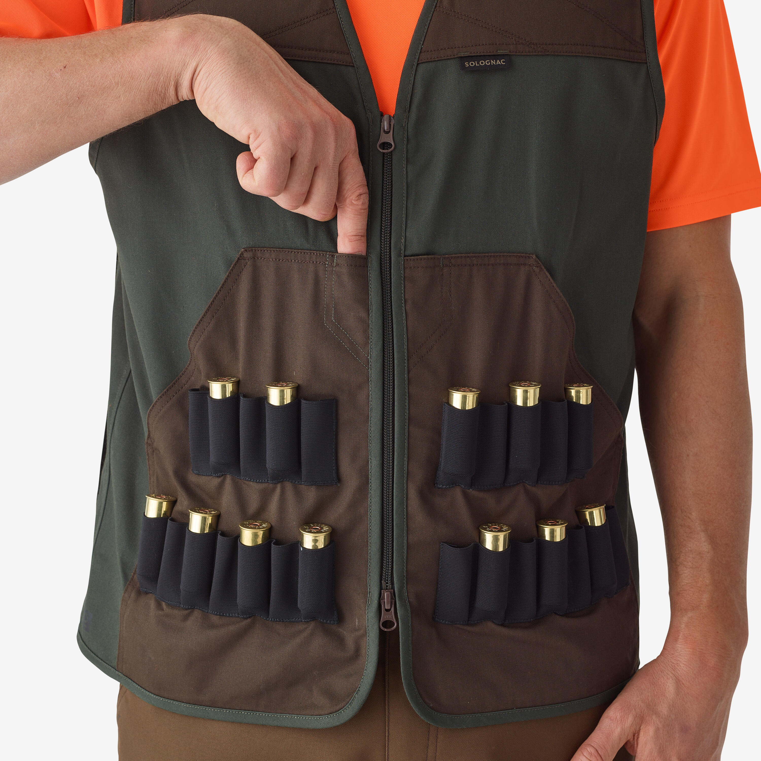 S ojačanim panelima na ramenima, ovaj prsluk vam omogućava da se slobodno krećete u svim biotopima. Ima torbu za ulov i redenik za 24 patrona kalibra 12, 16 i 20.