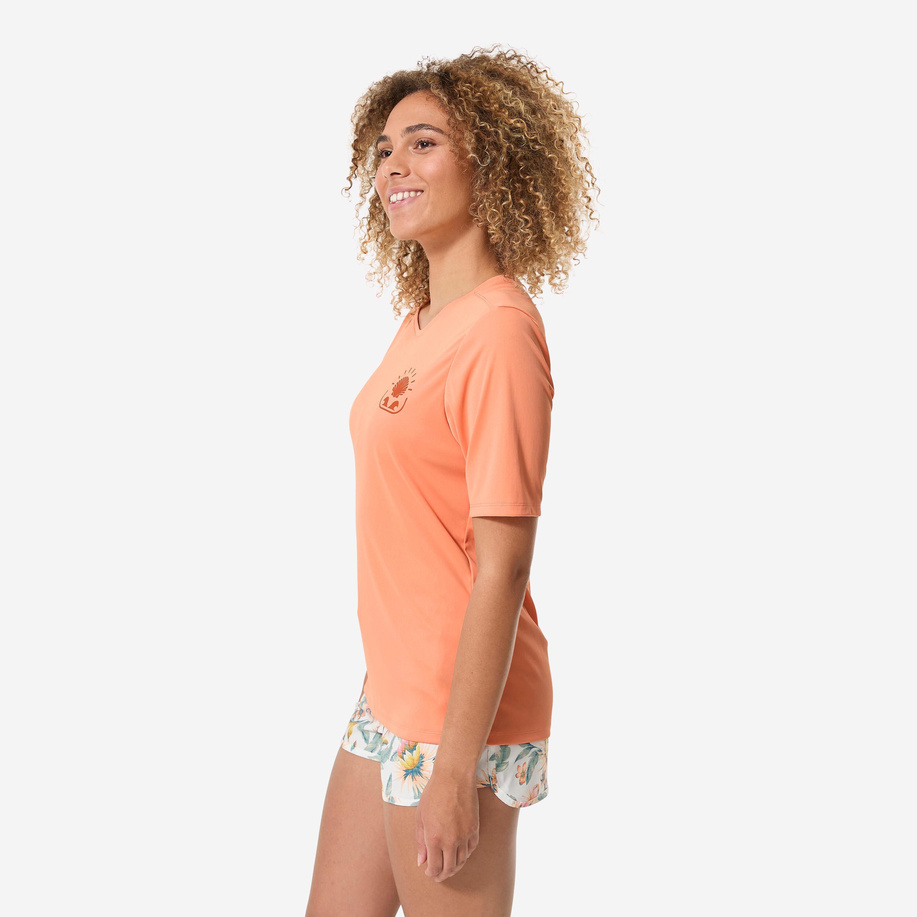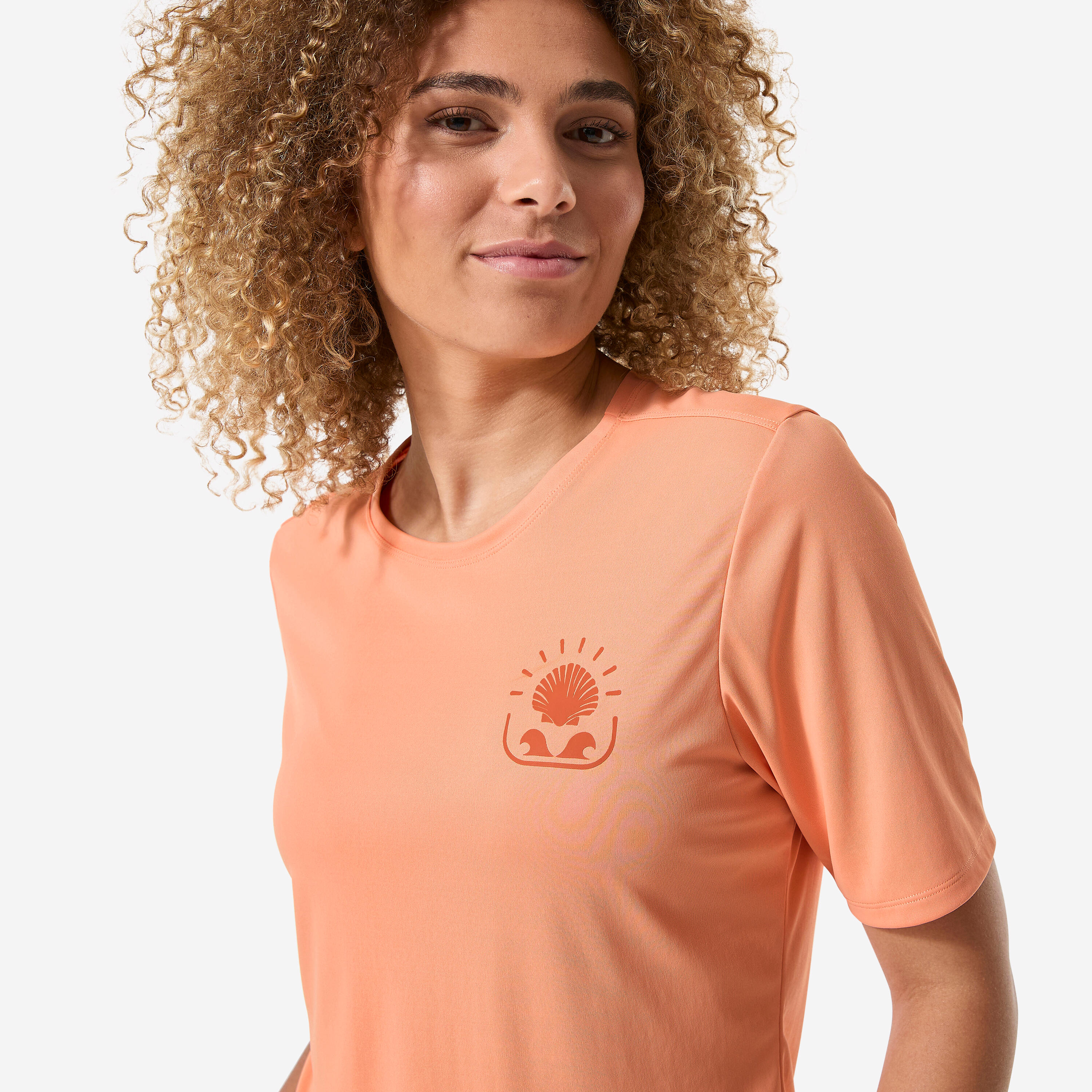 Ova majica kratkih rukava vas štiti od sunca, čak i u vodi, i smanjuje trenje. Njen komotan kroj i uzorak sa školjkama pružaju joj opušten stil i na plaži i u vodi.