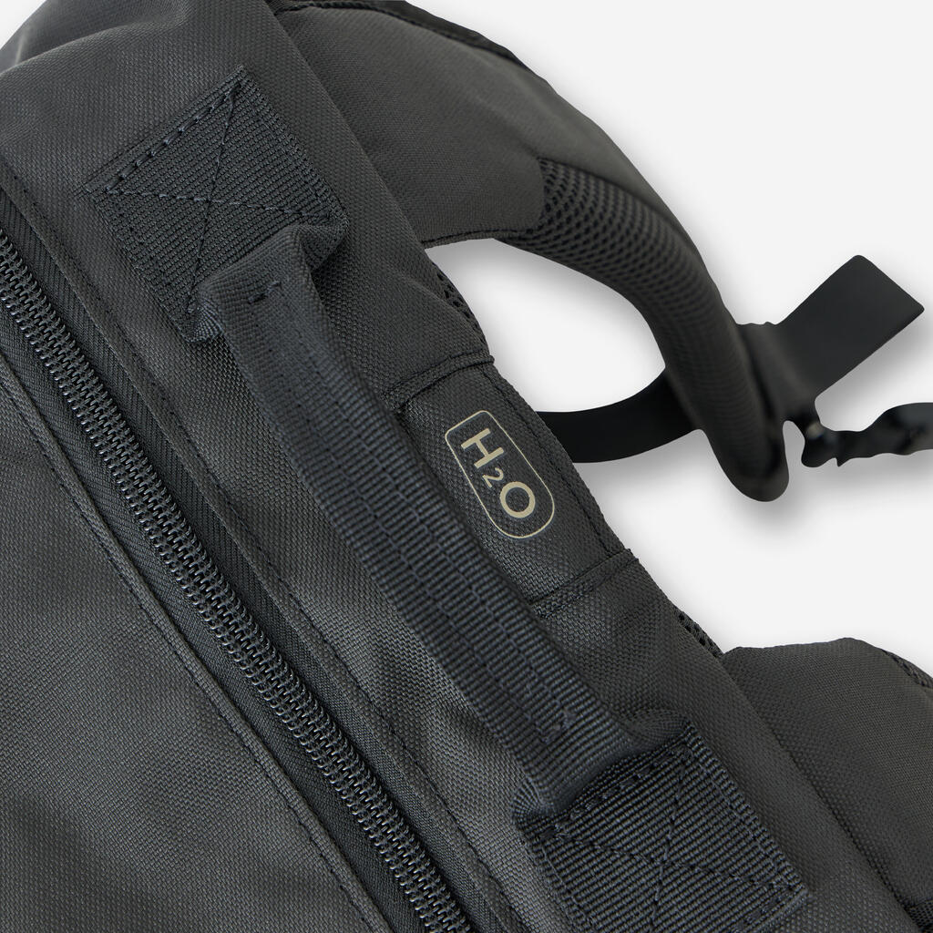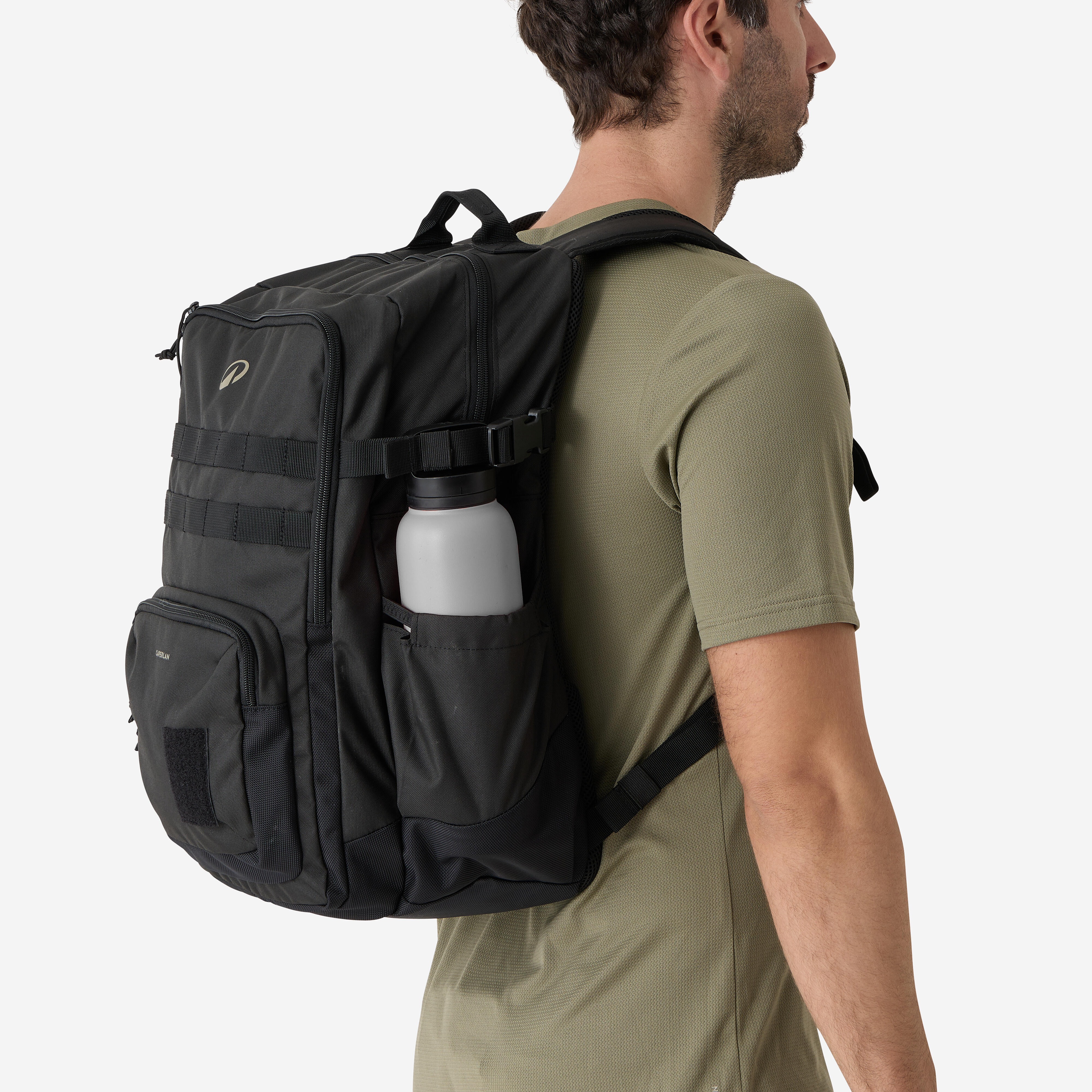 Sa spoljne strane, tu su 2 elastična džepa za bočice s vodom. Par centimetra iznad, nalazi se 1 kaiš: može se koristiti za nošenje dugačkih predmeta (kao što je tronožac). Npr. možete smestiti noge tronošca u džep za bočicu s vodom, i kaiš će ih držati u mestu.