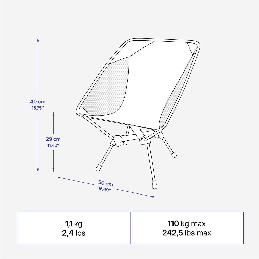 Ova stolica je teška samo 1,1 kg i može da se koristi svuda zahvaljujući navlaci za skladištenje. Može da podnese do 110 kg. Brzo se rasklapa zahvaljujući ugrađenim elastičnim trakama.