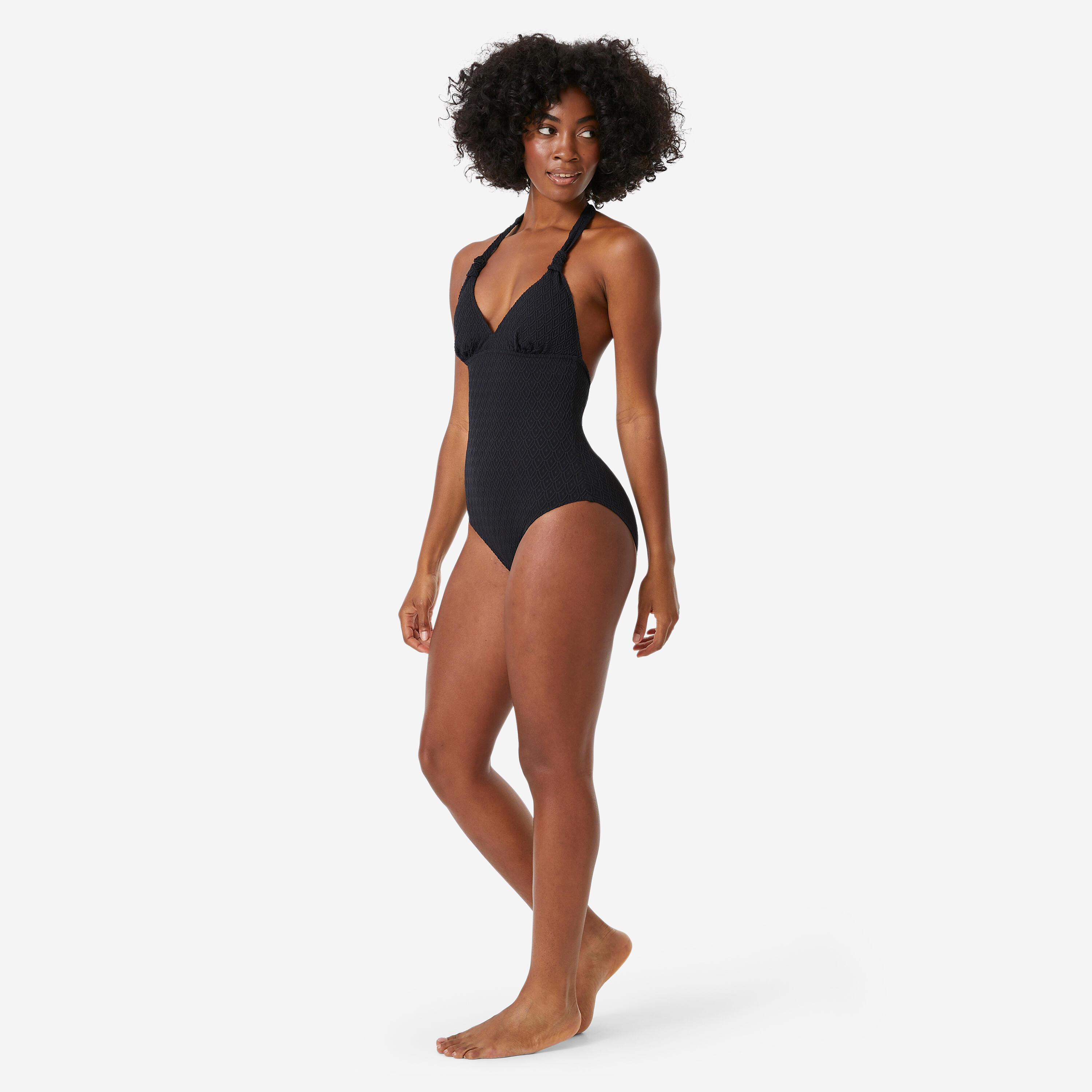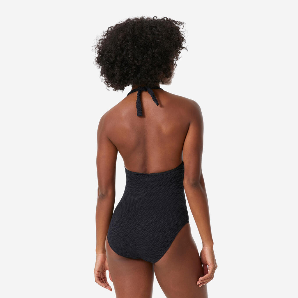 Ovaj ženski jednodelni kostim s vezivanjem oko vrata i otvorenim ramenima i leđima je veoma ženstven.Ostaje na mestu u veoma malim talasima.